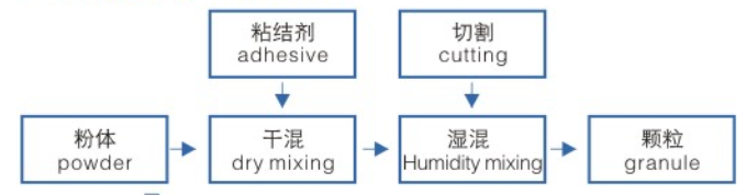 粉體物料與結(jié)合劑在混合制粒機(jī)的圓筒形容器中由底部混合槳充分混合成濕軟軟材,然后由側(cè)置的高速粉碎槳切割成均勻的濕顆粒。
