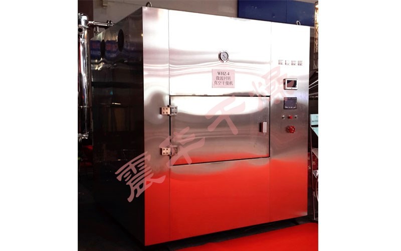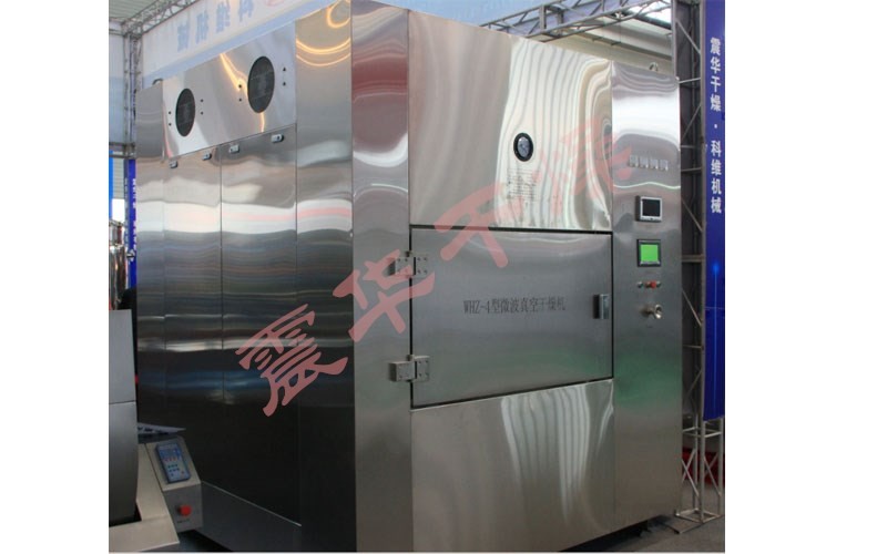 物料在真空狀態(tài)下,置放在作回轉(zhuǎn)運(yùn)動(dòng)的吊架上,吸收微波能量,使物料內(nèi)部水分在低溫狀態(tài)下迅速蒸發(fā),達(dá)到干燥目的。