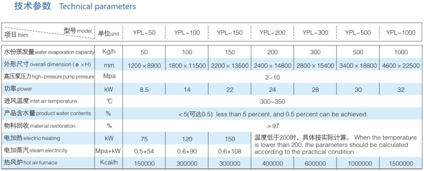 ■壓力噴霧干燥造粒機(jī)工作過(guò)程為料液通過(guò)隔膜泵高壓輸入,噴出霧狀液滴,然后同熱空氣并流下降,大部分粉粒由塔底排料口收集,廢氣及其微小粉末經(jīng)旋風(fēng)分離器分離,廢氣由抽風(fēng)機(jī)排出,粉末由設(shè)在旋風(fēng)分離器下端的授粉筒收集,風(fēng)機(jī)出口處還可裝備二級(jí)除塵裝置,回收率在96-98%以上。