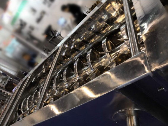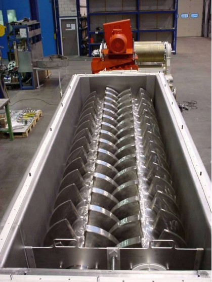 槳葉干燥機的空心軸上密集排列著楔型中空漿葉,熱介質(zhì)經(jīng)空心軸流經(jīng)漿葉。單位有效容積內(nèi)傳熱面積很大,熱介質(zhì)溫度從-40℃到320℃,可以是水蒸汽,也可以是液體型:如熱水、導(dǎo)熱油等。間接傳導(dǎo)加熱,沒有攜帶空氣帶走熱量,熱量均用來加熱物料。熱量損失僅為通過器體保溫層向環(huán)境的散熱。楔型漿葉傳熱面具有自清潔功能。物料顆粒與楔型面的相對運動產(chǎn)生洗刷作用,能夠洗刷掉楔型面上附著物料,使運轉(zhuǎn)中一直保持著清潔的傳熱面??招臉~干燥機的殼體為W型,殼體內(nèi)一般安排二到四根空心攪拌軸。殼體有密封端蓋與上蓋,防止物料粉塵外泄與收集物料溶劑蒸汽。 空心槳葉干燥機的出料口處設(shè)置一擋扳,保證料位高度,使傳熱面被物料覆蓋而充分發(fā)揮作用。